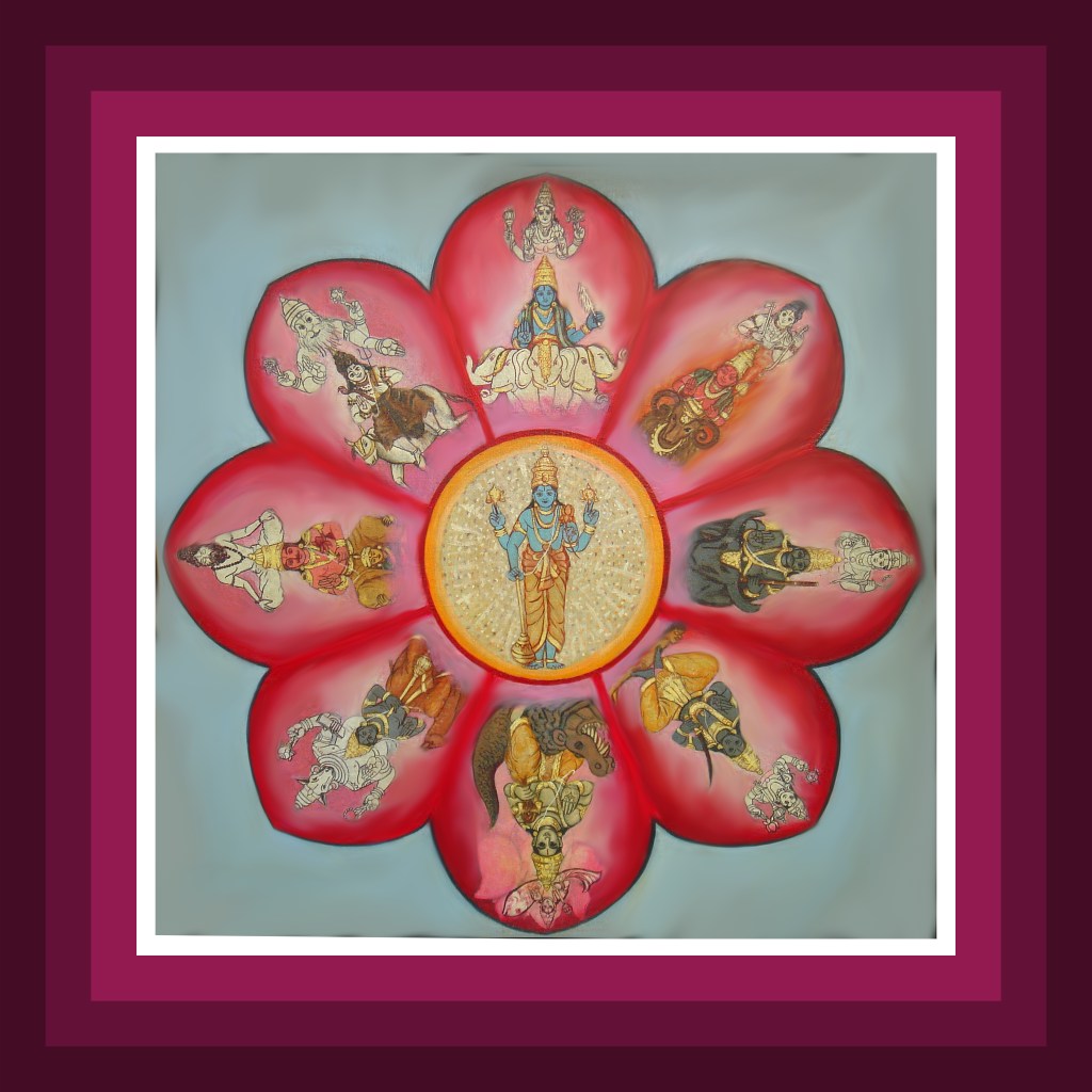 This lotus is located in the heart of a human body and its colour is red like that of a rising sun. The governing deities in the eight petals are – Indra, Agni, Yama, Nirarruti, Varuna, Pravaha Vayu, Kubera and Ishwara. These eight deities will be constantly worshipping the forms of Lord – Upendra, Parashurama, Rama, Janardana, Matsya, Hayavadana, Kapila and Narasimha. The controlling deity for this lotus is Lord Sankarshana – consort of Jaya and the governing deity is Indra. Also present in this lotus are the eight Vasu deities – Dosha, Vibheeshana, Drona, Dhruva, Prana, Dyu, Arka, Vahni along with seven Marut deities – Nala, Anila, Pratibha, Kumuda, Kanta, Shuchi and Shweta.