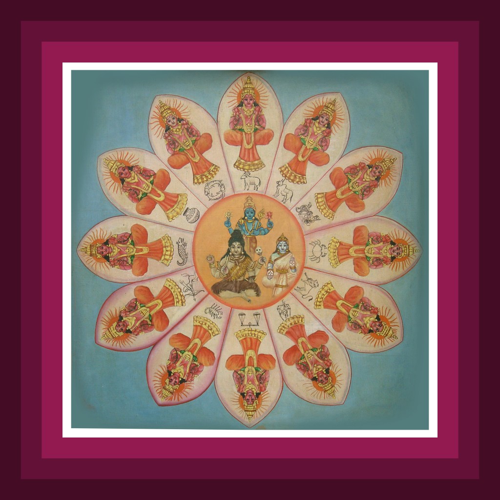 This pearl coloured lotus is located in the chest region of a human body just above the heart. The controlling deity is Lord Sri Hari and the governing deity is Maha Rudra-consort of Girija. Twelve deities from the sun group are present in the twelve petals-Vivaswan, Aryama, Poosha, Tvashta, Savitha, Bhaga, Dhata, Vidhata, Varuna, Mitra,Shakra and Urukrama. The governing deity Rudra along with consort Parvati will be in constant worship of Lord Almighty’s form of Sri Lakshmi Narasimha. The seven Marut deities – Ajita, Guru, Jhumjhum, Samvartaka, Keela, Jita and Sowmya are also present in this lotus.