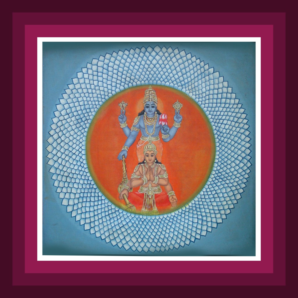 The two petalled lotus is located below the forehead and in between the eye brows of a human body and is red in colour like the flower Madhu. The four faced deity Brahma-consort of Saraswati is present in one petal and deity Mukhya Prana-consort of Bharati in the other petal. Lord Sri Krishna is the controlling deity for this lotus which is governed by the deity Garuda, the Lord’s vehicle who is an embodiment of Vedic meters. Garuda will be constantly worshiping Lord Sri Krishna through Vedic hymns. Also present in this lotus are the seven Marut deities – Pika, Shuka, Bheema, Yati, Hanu, Pinga, Kampana.