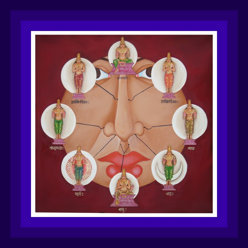 At the base of the nose, Lord Dhanvantri resides as the controlling deity. Ashwinis -Nasatya and Dasra, physicians for other deities are the governing deities. The Lord resides in the right and left nasal cartilages as Rutumbara and Roogha. In both these forms His hands are in the knowledge and grace pose. Surya and Chandra are resident in the right and left nostrils. Along with them is Lord Mukhyaprana who served by Surya, Chandra allows one to breathe air in and out.