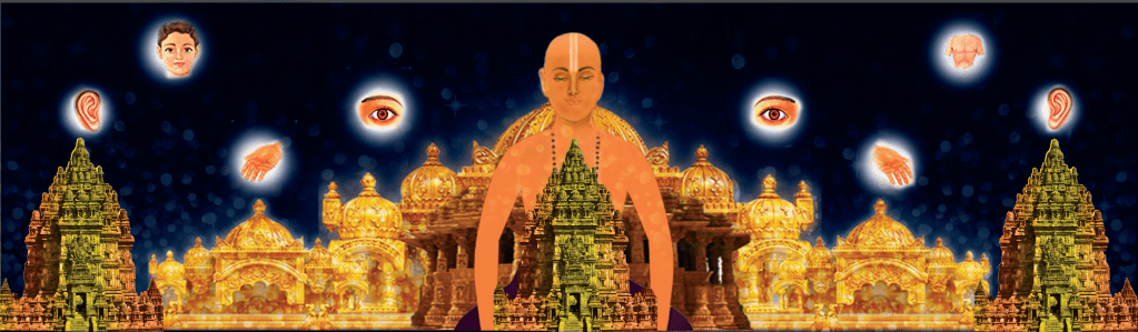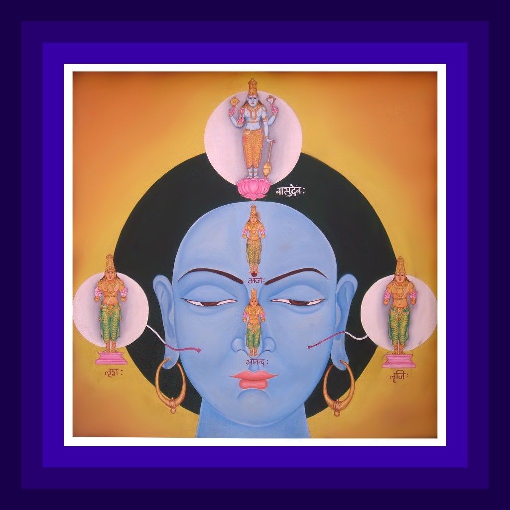 The Lord is resident in every living being’s head as Vasudeva. He is white in colour. The Lord resides in forehead in the name of Aja, with His two hands in the knowledge and grace pose. In the right and left cheeks, the Lord resides in the names of Lsha and Leeji. In both these forms, the Lord’s hands are in the knowledge and grace pose. In the nose, the Lord resides as Ananda and His hands are in the knowledge and grace pose.