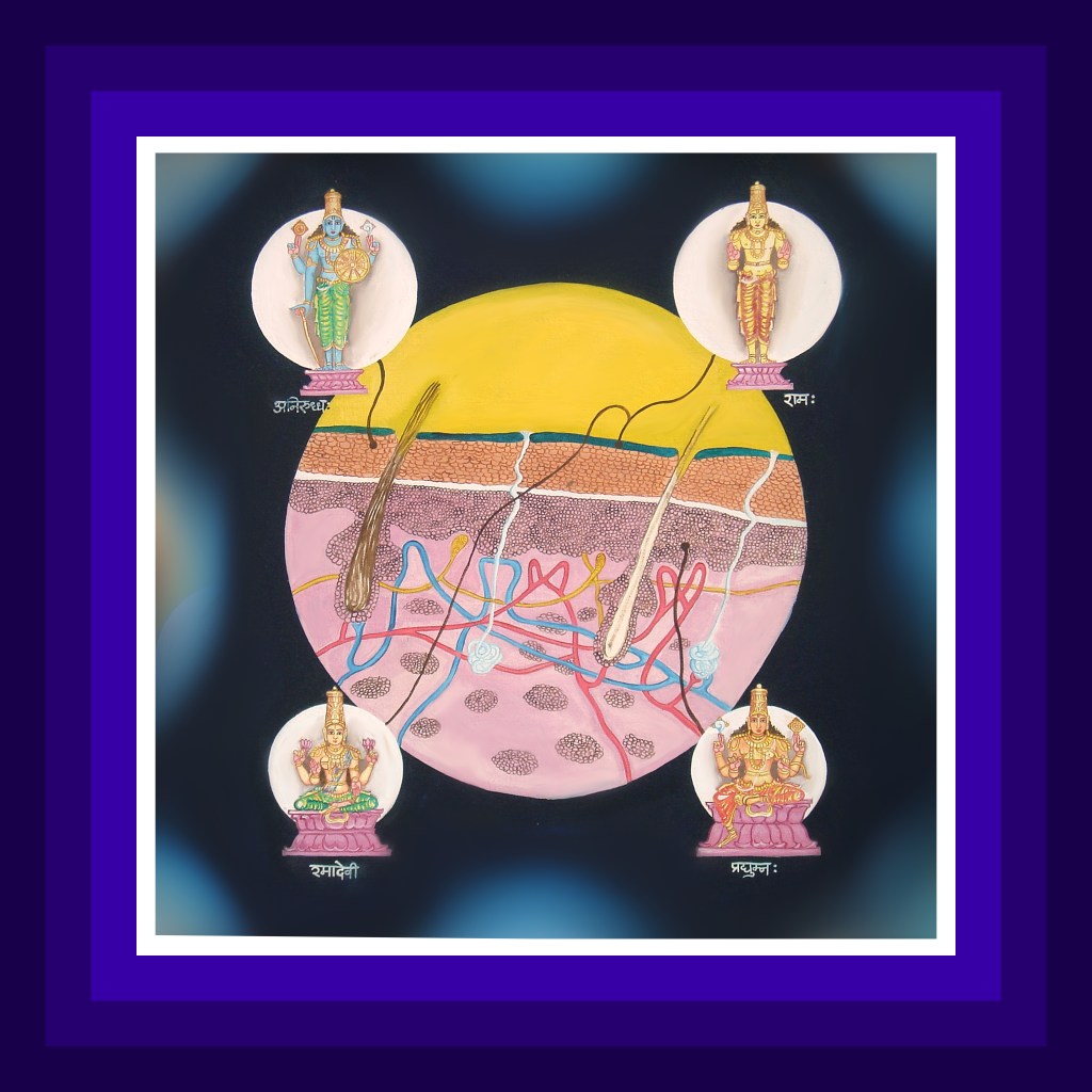 Skin is the thick layer covering the human body like a blanket. Lord Almighty Pradyumna also known by the name of Udhgeetha is resident in the skin continuously protecting the body from external elements. Lord Ramachandra is also resident here giving it lustre. The organ responsible for the sensation of touch is called tvak. This is pervaded by deity Vayu. Lord Aniruddha is present here in the name of Prasthava. Also, resident is His consort Lakshmidevi.