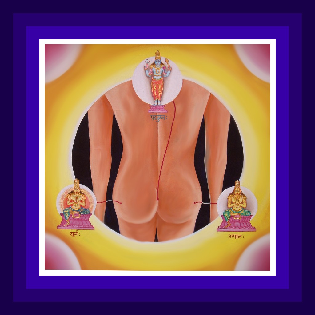 The Lord in the name of Bali will be present in the posterior and will be sporting the knowledge and grace pose in His hands. Surya in the name of Mitra, is the governing deity for the organ of excretion. Also present here is deity Apanavayu who facilitates the process of excretion. Lord Pradyumna is the controlling deity here.