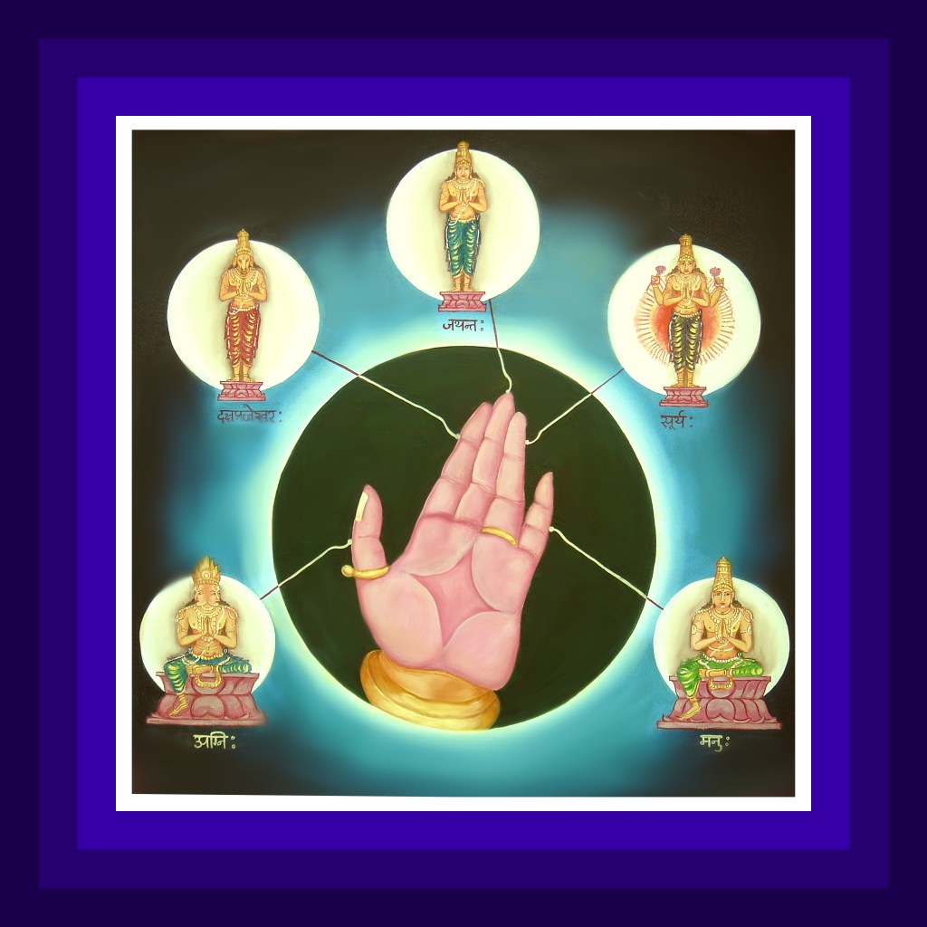 In the five fingers of the left palm, the governing deities for the sense organs – tongue, hands, feet, organ of excretion and reproduction are present as follows: Agni in thumb, Dakshaprajeshwara in the index finger, Jayanta in middle finger, Mitra in ring finger and Manu in little finger.