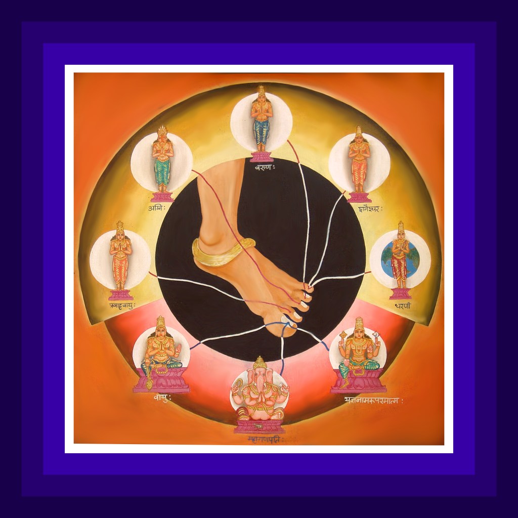 Resident in the big toe is Ganapathy, the governing deity for the element of space. In the second toe, Pravaha Vayu is resident as the governing deity for the element of wind. In the middle toe, Agni is resident as the governing deity for the element of fire. Varuna is resident in the fourth toe as the governing deity for the element of water. Resident in the little toe are Shaneishchara and Dharanidevi, the governing deities for the element of earth. One should visualize the above deities in the respective toes. Giving strength to the left foot to carry the weight of the body, deity Vayudeva and Lord Sri Hari in the form of Bharabrit will be resident in the big toe.