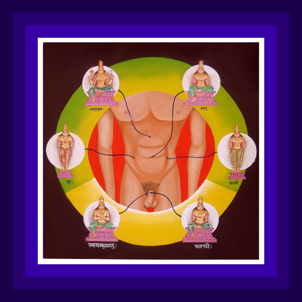 In the right side of the abdomen, the Lord resides in the form of Para signified by the consonant pa. In the left side of the abdomen, the Lord resides as Phalee signified by the consonant pha. In both these forms, the Lord will be sporting the knowledge and grace pose with His hands. In the centre of the abdomen the Lord resplendent in the colour of sky blue will be residing in the original form, Narayana. In this form, the Lord will be holding conch-disc-mace-lotus in His hands. In the private parts, the Lord will be resident in the name of Manu, signified by the consonant ma. In this form, the Lord will be sporting the knowledge and grace pose with His hands.
