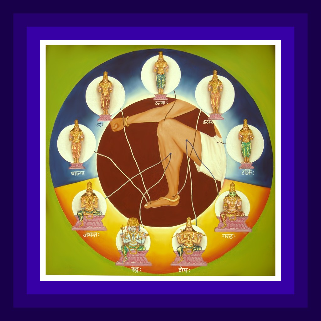 The Lord resides in the five joints in the forms of tara, thaba, dandee, dhanvi and namya. In these forms, the Lord will be sporting the knowledge and grace pose in His hands. The King of heaven, Devendra’s son Shambhu is the governing deity for the left leg with his indwelling Lord Sumedha as the controlling deity. Also resident in the left leg are Indra and Kama who are the governing deities for the principle of mind..