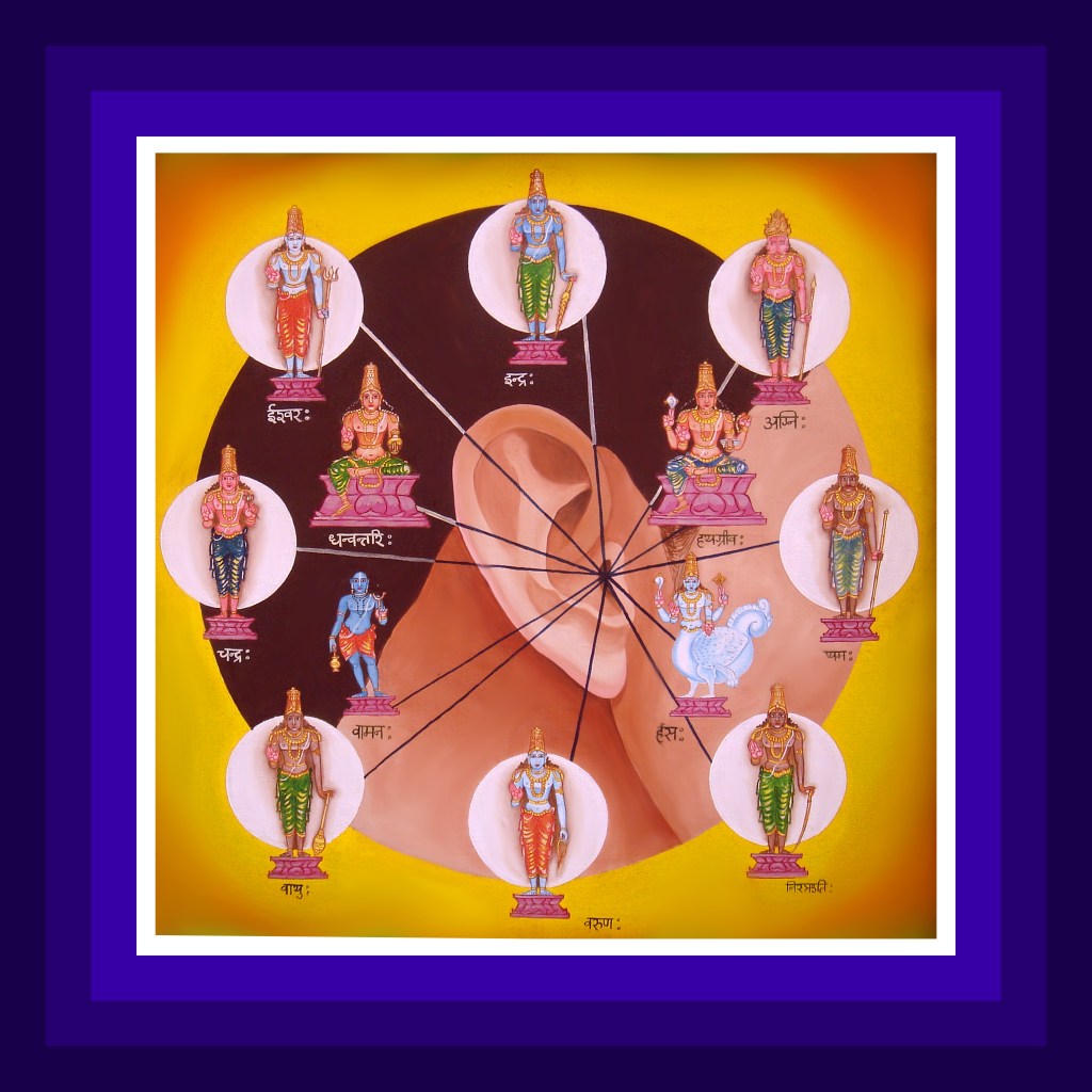 Yama-Nirraruti- Varuna- Vayu-Kubera-Ishwara.They are the governing deities for the organ of hearing. Indwelling in these deities is Lord Almighty in four forms Dhanvantri-Hayagreeva-Hamsa-Vamana as the controlling deities for the principle of hearing. The governing deities such as Indra are ordered by the Lord to first hear the words and then cause the living beings to hear them. The Lord resides in the right ear in the name of Ugra and in the left ear in the name of Oorja and both these forms are sporting the knowledge and grace pose in their hands. Sacred rivers such as the Ganges also reside in the right ear.