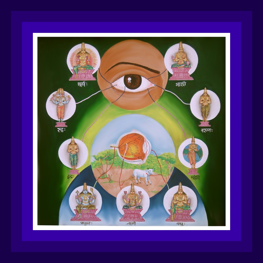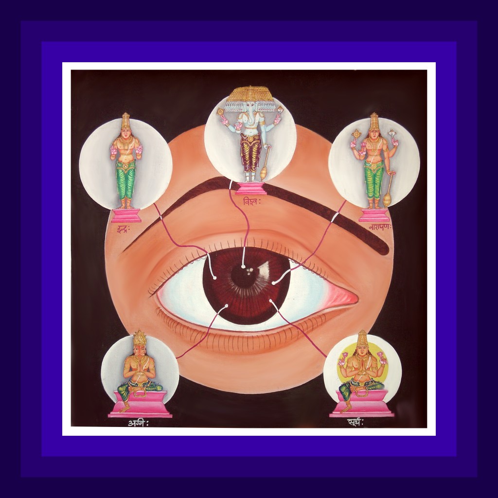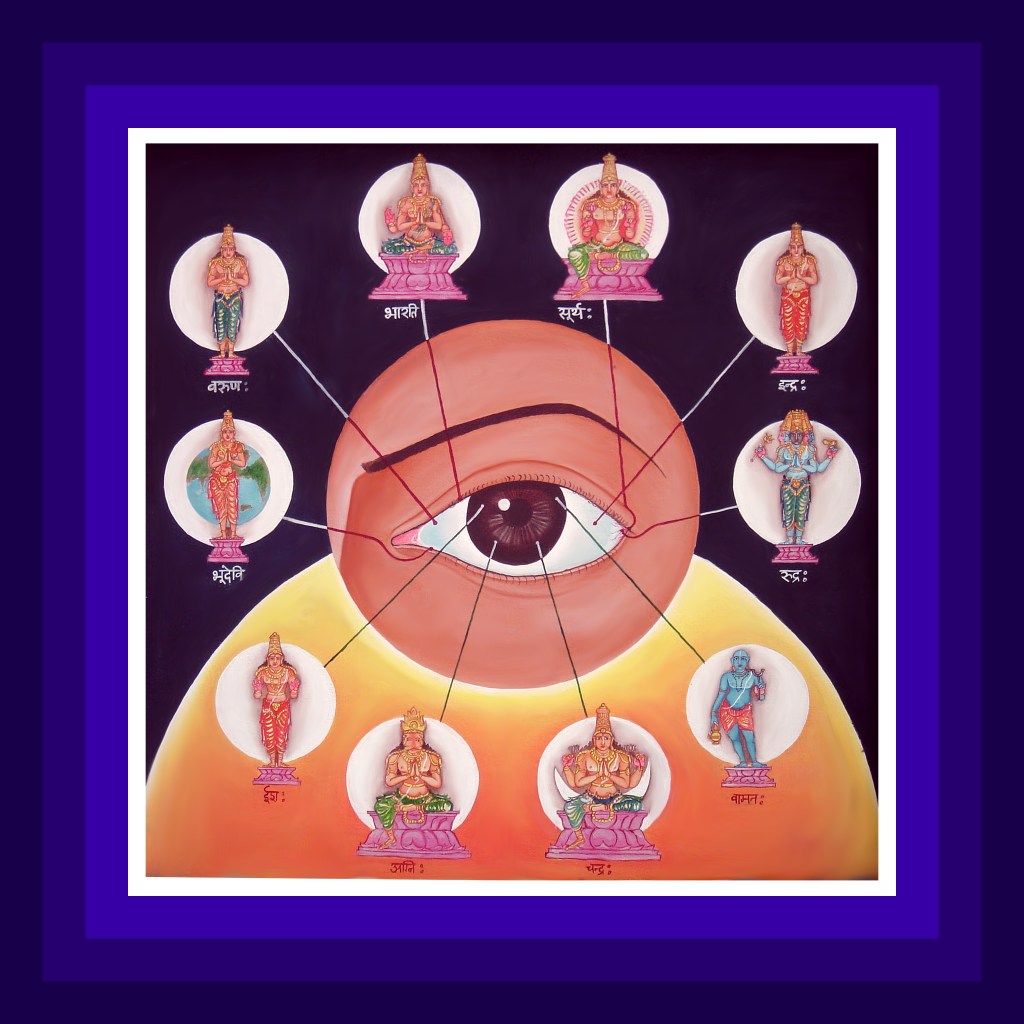 కంటిలోని తెల్లటిగుడ్డులోని ఎర్రటి రక్తనాళాలలో రుద్రదేవుడు ’గౌతమ’ అనే పేరుతో, కన్నీళ్ళల్లోవరుణదేవుడు ‘భరద్వాజ’ అనే పేరుతో, తెల్లటిగుడ్డులో దేవేంద్రుడు, ‘వశిష్ఠ’ అనే పేరుతో, సన్నిహితులై ఉంటారు. క్రింది కనురెప్పలలోభూదేవి, పైకనురెప్పలలో భారతీదేవి సదా సన్నిహితులై రెప్పలకు చైతన్యంకలిగించి, కళ్ళను కాపాడుతూ ఉంటారు. కంటిగుడ్డులో సూర్యుడు ఉంటాడు. కళ్ళవ్యాపారాలకు కారణుడై, ప్రద్యుమ్ననామకపరమాత్ముడు కంటిమధ్యలో స్తంభరూపంతో ఉంటాడు. ఈ స్తంభానికికట్టిన త్రాడురూపంలో మహాలక్ష్మీదేవి, ఆవుదూడరూపంలో వాయుదేవుడు సదా నెలకొనిఉంటారు.