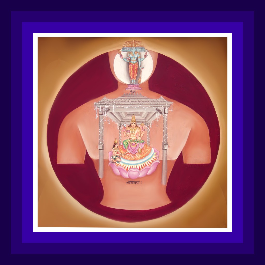 The Lord resides in the throat in the form of Taijasa, responsible for the dreaming state. White in colour, His hands will be holding disc-conch-mace-knowledge pose. Just like the Vishwa form, this form also has 19 faces with an elephant face in the middle. Inside the heart is a decorated, golden platform, an embodiment of Goddess Rama. In the middle are the circular zones of Surya, Chandra and Agni. On top is the lotus with indwelling Goddess Rama. Lord Narayana is sitting on this lotus. Deity Vayudeva as Lalooka will be holding the right foot of the Lord with the individual soul at his feet.