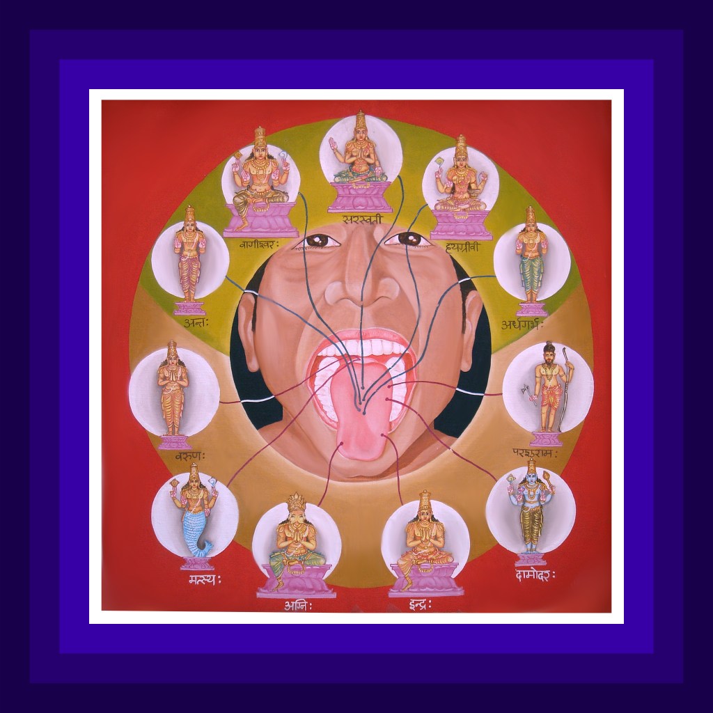 నాలుకలో మత్స్య-అంత-దామోదర అనే భగవంతుని 3 రూపాలు ఉంటాయి. ఇవి నాలుకకు నియామక రూపాలు. వరుణుడు అభిమానిదేవత. ఈ వరుణినియందు మత్స్యరూపి భగవంతుడు అంతర్యామిగాఉంటూ అతనికి ప్రేరణచేస్తూ ఉంటాడు. నాలుకకు సరస్వతీదేవి కూడా అభిమాని. ఈమెకు నియామకులుగా స్త్రీరూపంతో హయవదనుడు, వాగీశ్వ రుడు నాలుకలో ఉంటారు. వాగింద్రియమునకు అగ్నిదేవుడు అభిమాని. పరశురాముడు నియామ కుడు. చిన్ననాలుకకు ఇంద్రుడు అభిమాని. ఉపేంద్రుడు నియామ కుడు. చిన్ననాలుకలో జ్ఞాన-అభయ