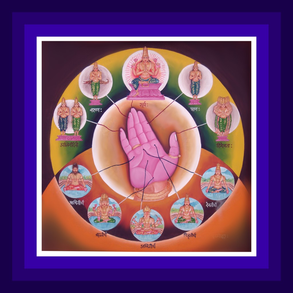 ಅಂಗೈಯಮಧ್ಯದಲ್ಲಿ-ಅಗ್ನಿತೀರ್ಥವು, ಹೆಬ್ಬ್ಬೆರಳಿನ ಮೂಲದಲ್ಲಿ-ಬ್ರಹ್ಮತೀರ್ಥವು, ಕಿರುಬೆರಳಿನ ಮೂಲದಲ್ಲಿ-ಋಷಿತೀರ್ಥವು, ತರ್ಜನೀಮೂಲದಲ್ಲಿ-ಪಿತೃತೀರ್ಥವು, ಮಧ್ಯಮ ಮತ್ತು ಅನಾಮಿಕಾ ಬೆರಳುಗಳ ಮೂಲದಲ್ಲಿ-ದೇವತೀರ್ಥವು ಇರುವವು. ಹೆಬ್ಬೆರಳಿನಲ್ಲಿ ಶೋತೃತತ್ವಕ್ಕೆ ಅಭಿಮಾನಿಗಳಾದ ದಿಗ್ದೇವತೆಗಳಿರುವರು. ತರ್ಜನೀ-ಬೆರಳಿನಲ್ಲಿ ತ್ವಕ್ತತ್ವಕ್ಕೆ ಅಭಿಮಾನಿಯಾದ ಅಹಂಕಾರಿಕಪ್ರಾಣದೇವನಿರುವನು. ಮಧ್ಯಮಬೆರಳಿನಲ್ಲಿ ಚಕ್ಷುಷ್ತತ್ವಕ್ಕೆ ಅಭಿಮಾನಿಯಾದ ಸೂರ್ಯನಿರುವನು. ಅನಾಮಿಕಾ ಬೆರಳಿನಲ್ಲಿ ಜಿಹ್ವಾತತ್ವಕ್ಕೆ ಅಭಿಮಾನಿಯಾದ ವರುಣನು, ಕಿರುಬೆರಳಿನಲ್ಲಿ ಘ್ರಾಣತತ್ವಕ್ಕೆ ಅಭಿಮಾನಿಗಳಾದ ಅಶ್ವಿನೀದೇವತೆಗಳು ಇರುವರು.
