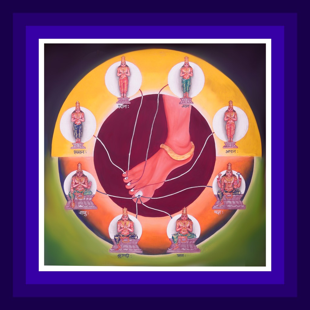 Resident in the big toe are Brihaspati and Ahankarikaprana, the governing deities for the principle of sound. In the second toe, Apana is resident as the governing deity for the principle of touch. In the middle toe, Vyana is resident as the governing deity for the principle of sight. Udana is resident in the fourth toe as the governing deity for the principle of taste. Resident in the little toe is Samana, the governing deity for the principle of smell. One should visualize the above deities in the respective toes. Giving strength to the right foot to carry the weight of the body, deity Vayudeva and Lord Sri Hari in the form of Bharabrit will be resident in the big toe.