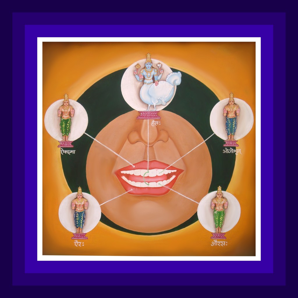 పై పెదవిలో ఏకాత్మనామక పరమా త్ముడు, క్రింది పెదవిలో ఐరనామక పరమాత్ముడు ఉంటారు. వీరిరువురూ జ్ఞాన-అభయముద్రలతో సహితులై, పెదవులను వ్యాపించివుంటారు. పై వరుసలోని దంతాలలో జ్ఞాన-అభయ ముద్రలతోకూడిన ఓజోభృత్నామక పరమాత్ముడు. క్రింది దంతాల పంక్తిలో, జ్ఞానాభయ ముద్రలతో సహి తుడైన ఔరసనామక పరమాత్ముడు ఉంటారు. హంసనామక పరమా త్ముడు 32 పళ్ళను వ్యాపించి, వాటికి సదా రక్షకుడై ఉంటాడు. ఈ హంసనామక పరమాత్ముడు, తన నాలుగు చేతులలో క్రమంగా చక్ర-శంఖ-వర-అభయముద్రలనుధరించి ఉంటాడు.