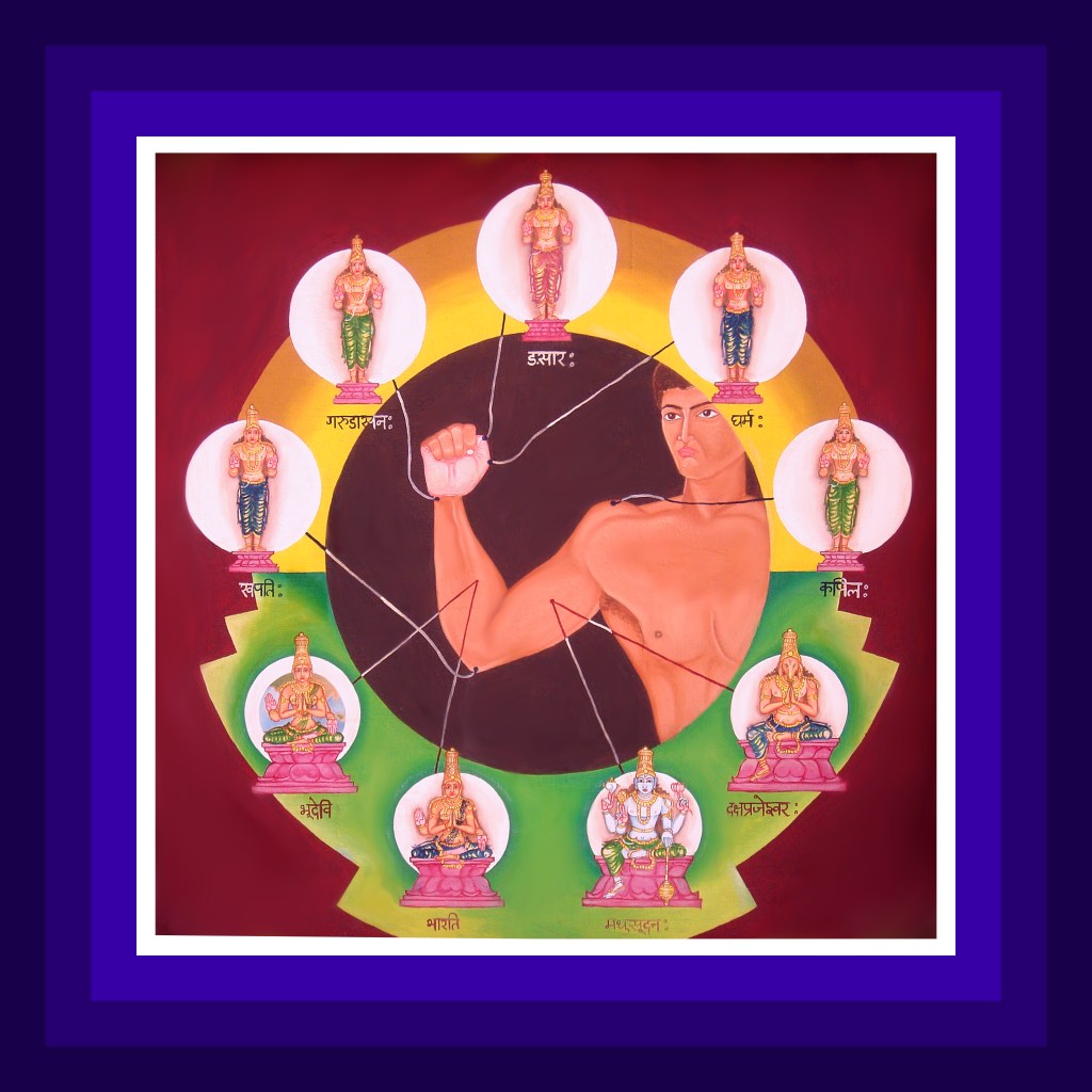 The Lord in the forms of kapila, khapati, garudasana, gharma and ngasara is present in the five joints of the right hand. Dakshaprajeshwara is the governing deity with the indwelling Lord Madhusoodana as the controlling deity. Also resident in the right hand are Saraswati – consort of Brahma and Bharatidevi – consort of Vayudeva. They are the governing deities for the principle of unmanifest. Goddess Mahalakshmi as the primary governing deity for this principle is also resident in the right hand.