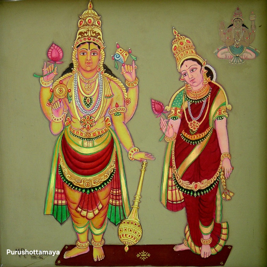 Lord Almighty is known as Purushottama as He is the supreme most among all souls. He is superior to Kshara souls (those with decaying body) and Akshara (Goddess Mahalakshmi who has a transcendental body not subject to decay). He is the controller for the following: element of sight, letter ‘dhee’ in the Gayatri hymn, gopichandana symbol on the right side of stomach in fortnight of waning moon, and food items made with cardamom, mustard, camphor, hing.