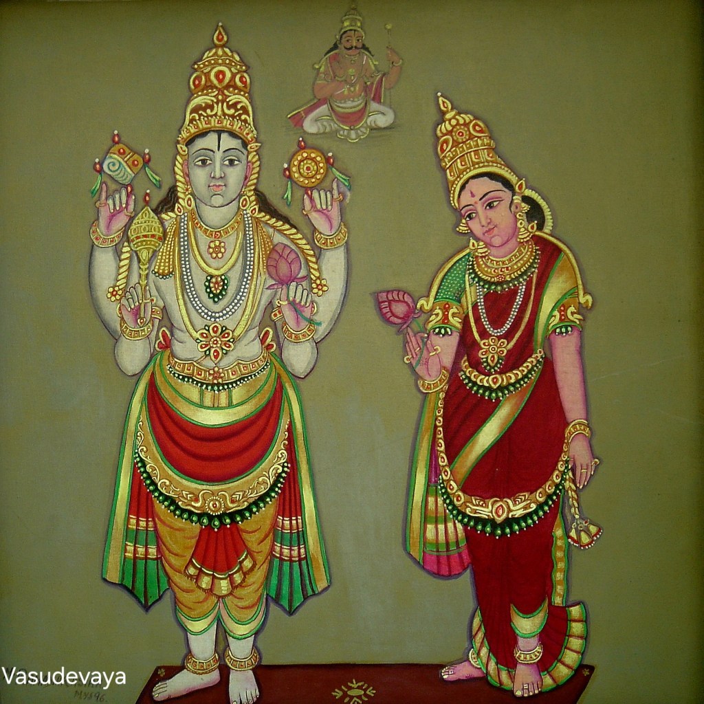 Lord Vaasudeva is the controller for the following: organ of reproduction, letter ‘dhee’ in the Gayatri hymn, gopichandana symbol in the centre of stomach in fortnight of waning moon, food items: sugar, jaggery, sheath of special knowledge, winter season, attribute of Brahmanas (scholarly class), the time period of evening, objects causing Sattvic quality, the age of Kruta, in one’s head and in male bodies. He is indwelling in deity Vayu who will be guarding the upper entrance of His abode and also in deity Surya. He creates space for all deserving beings and one should remember Him at the time of eating.
