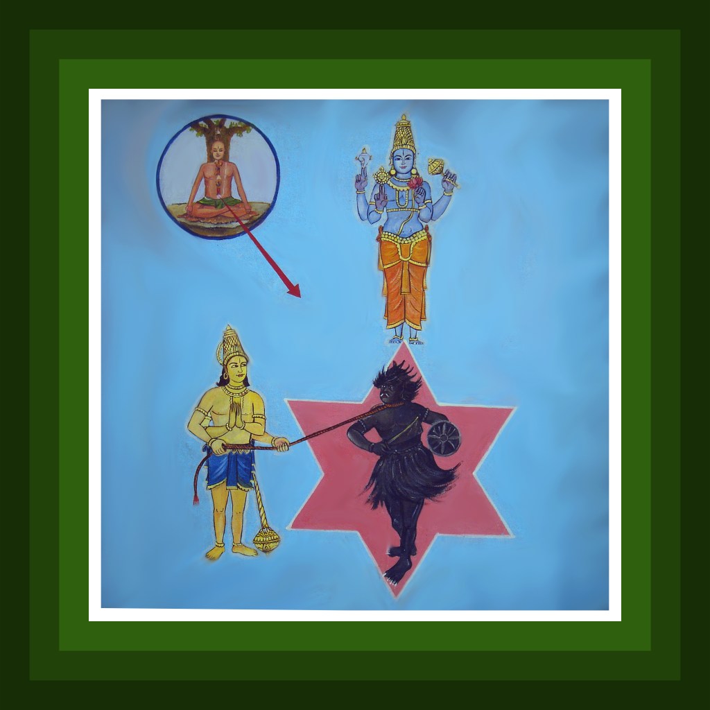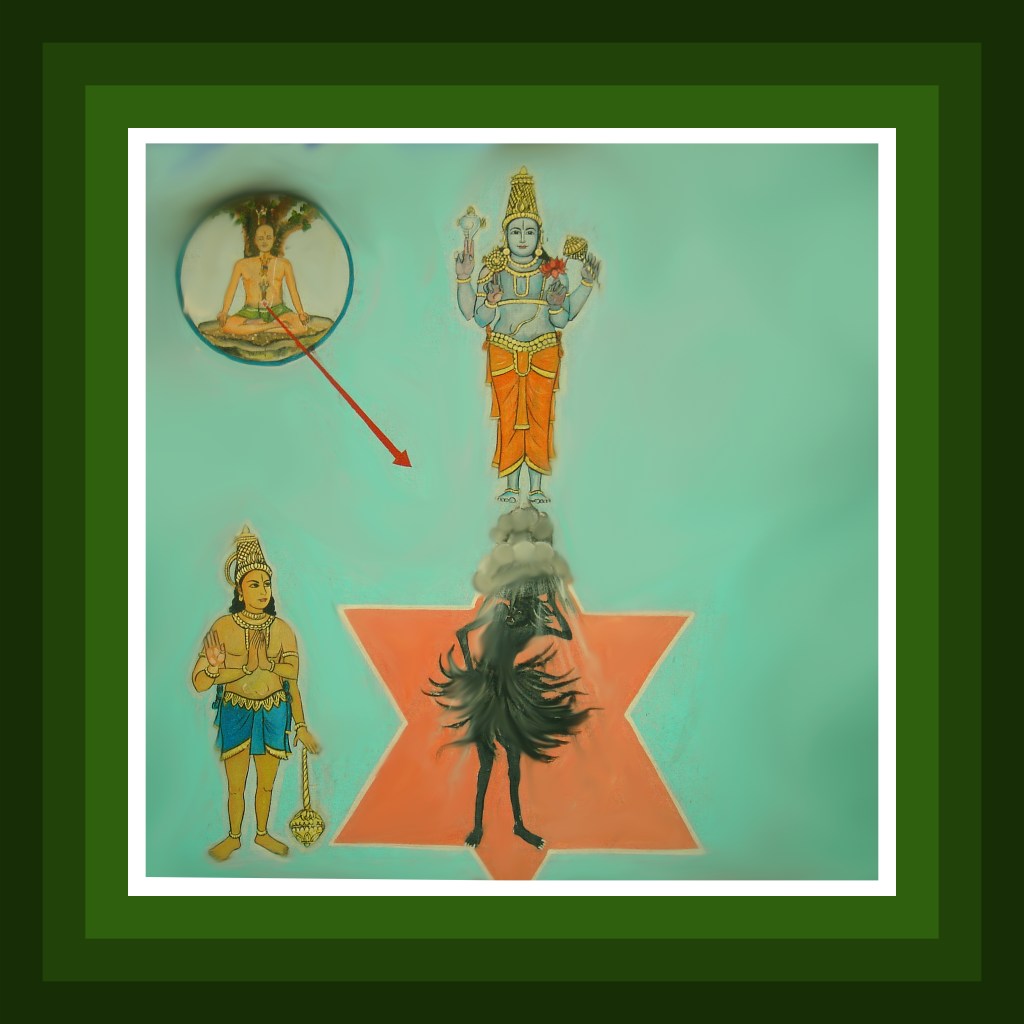 One should visualize the virtuous spirit dragging the sinful spirit whose limbs represent great sins such as murder, stealing gold etc., in front of Lord Pradyumna resident in one’s navel. Upon prayer by the virtuous spirit, Lord Pradyumna through strength bestowed on Vayu- the deity of wind completely eviscerates the sinful spirit. During this time, the seeker should be chanting the seed hymn of Vayu, ‘Om Yam Om’ holding his breath still for six times.