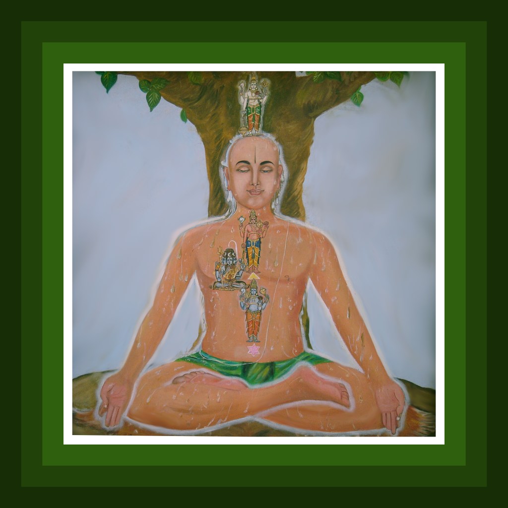 Inside one’s navel in a hexagonal circle resides blue coloured Lord Pradyumna spoken as the primordial seed of Vayu. Inside one’s heart in the triangular circle resides blood red coloured Lord Sankarshana spoken as the primordial seed of Agni. Inside one’s head in a circular zone resides white coloured Lord Vasudeva spoken as the primordial seed of Varuna. On the right side of one’s stomach resides the virtuous spirit deity Vayudeva and on the left side is the sinful spirit. In the left side of one’s chest resides Lord Rudra, governing deity of mind.